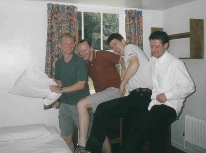 With a tactical game plan, the intelligence and cunning of which bore all the hallmarks of being devised by Big Brother's Helen, Team Sid were restricted to speculative corner-flag bound efforts. To be fair though, they weren't helped by Cookie assuming his customary left-back role when instructed to make a nuisance of himself at centre-forward. Neither team was able to capitalise on referee Wolfie's stout refusal to make anything approaching a decision. However, he made one glaring exception when exposed to pressure from Team Sid defenders, the like of which Roy Keane and the rest of the MUFC toe-rags would have balked at, dubiously ruling offside another first-half strike from Hawkins. Given that our intrepid hero with the whistle was stood in the centre-circle at the time of the incident, one can only surmise that with such telescopic eyesight NASA made an even greater blunder with what they sent up into space on the last Hubble mission. It should be noted that many Allstars arrived at this year's game in much better physical shape than previous encounters. Nowhere was this 30-something re-emergence of athletic prowess more evident, than in the person of Sid McKinlay. Sadly though his 20 minutes sojourn out of goal saw the 12 stone fitness freak match his previous 70 minutes in nets, by again failing to make any significant touch on the very match ball he had supplied. Elsewhere, Max Halliwell seemed the Allstar most overawed by the emotional turmoil of re-acquaintance with some friends for the first time in over a decade, continually grappling unsuspecting victims to the ground. What the watching Mrs H made of both this, and Shaggy's lamentable open-goal miss (following a rare Mincer foray up the right-wing), whilst she videoed the event for posterity, is anyone's guess. Thankfully the videotape had run out by the time of the traditional post-match penalty competition, with Team Sid winning 8 to 4. Despite being deprived of a hat-trick, Dr. Hawkins was duly presented with the Man of the Match award after the game, and so a Simon Waters' golden 'magic' boot now proudly adorns a Nottingham mantelpiece. After providing such thrilling fayre in the afternoon, it was time for the Northern Allstars and their entourage to be entertained in turn by the comics at Jongleurs comedy club, later that evening. The following morning some Allstars paid campus a visit, checking out old haunts such as Kane's bedroom (!) - see picture below. Sunday lunch in the Rose & Crown completed another thoroughly enjoyable reunion weekend. Thanks to everyone who made it; looking forward to meeting up again next July. Thanks also again to Nigel and the university groundstaff for enabling the game to go ahead, and to Marc for supplying a largely scent-free set of kits. |